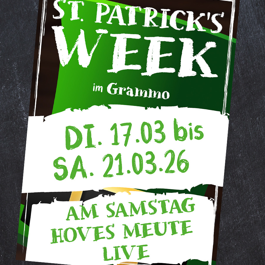 Ab Dienstag den 17.03.2026 feiern wir mit den Iren den St. Patricks Day. Und das bis einschließlich Samstag den 21.03.2026. Es gibt im Grammo also eine St. Patricks Week. Dazu passt das Konzert mit Hoves Meute am 21.03.2026. Als großes Finale sozusagen.